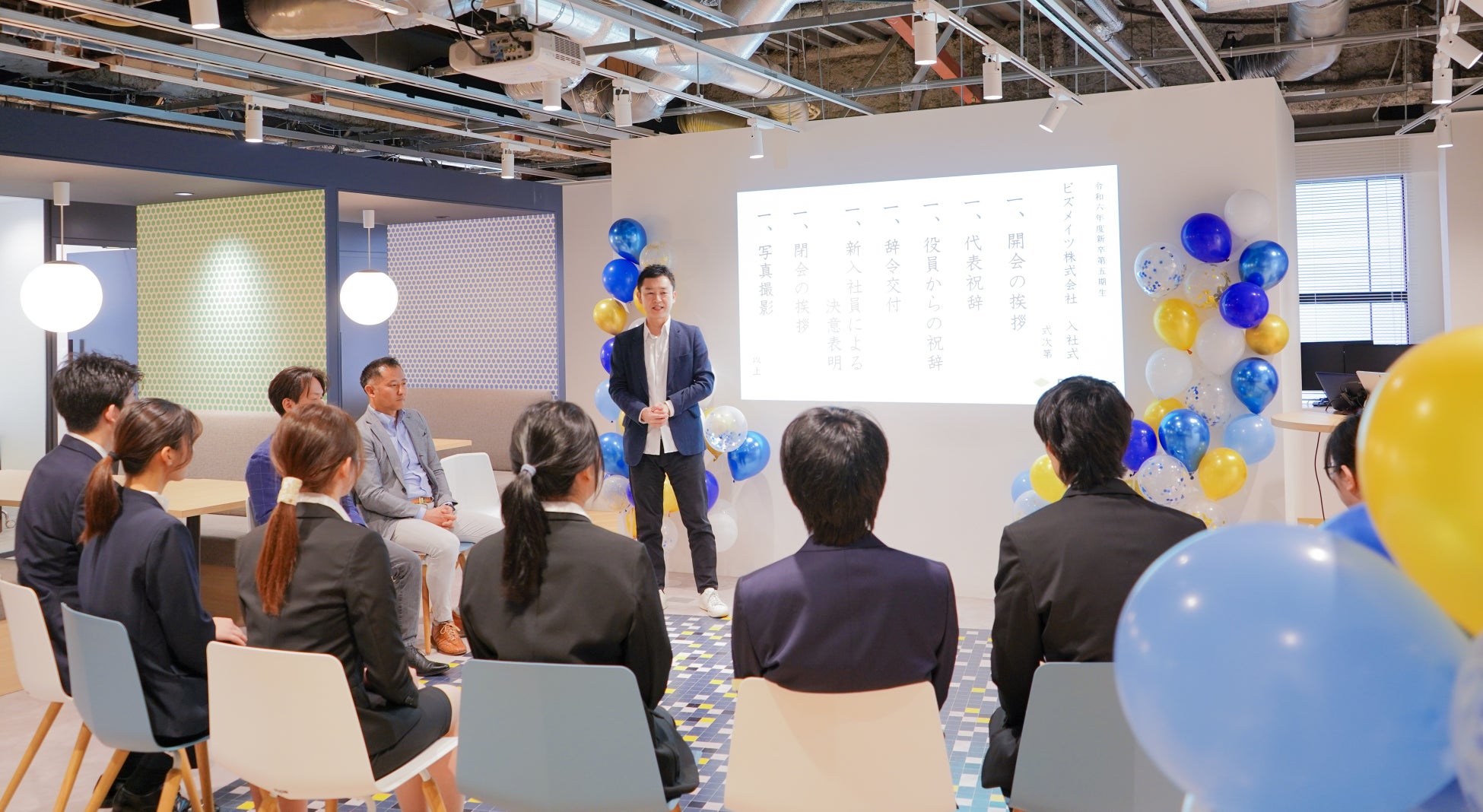 「当社は、昨年3月30日に東京証券取引所グロース市場への上場を果たし、企業として新たなステージへ挑戦し続けています。なので、皆さんにも今までのやり方にとらわれず、どんどん新しい挑戦をしてほしいと思っています。皆さんの新鮮な視点を生かし、積極的に先輩社員と意見交換を行い、疑問点は遠慮なく質問してください。そのような能動的な行動が、当社のバリューである『成長し続ける 』『建設的に対話する』『新しい価値を生み出す』ことにつながります。そして、 働くことや仕事を通じて成長をすることをいかに楽しむかというマインドを皆さんの中でいつまでも持ち続けていただきたいです。皆さんの若さ、エネルギー、情熱が、ビズメイツをさらに前進させる力になります。この一年が皆さんにとって大きな成長の機会になることを期待しています。ビズメイツの一員として、今日から一緒に頑張りましょう」