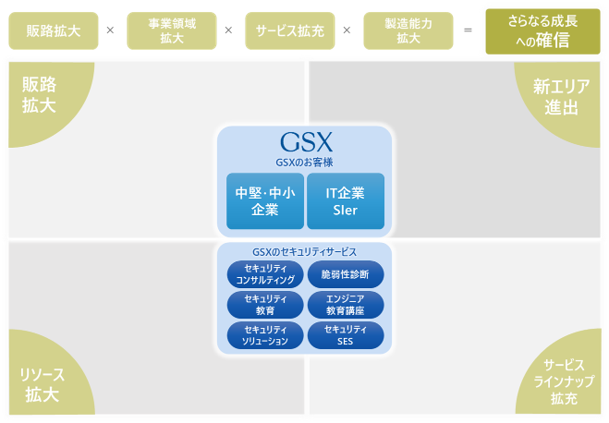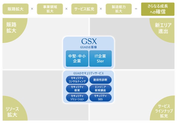 同社のサイバーセキュリティビジネス戦略における人材育成(リスキリング)・体制構築を支援すると共に、同グループ顧客へGSXが保有するフルラインナップのセキュリティサービスを提供する事で販路の拡大を狙う。