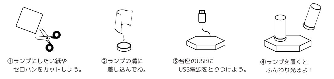 付属の材料をカットしたり、自分でイラストを描いてランプにセットすれば、簡単にオリジナルのランプシェードが作れます。