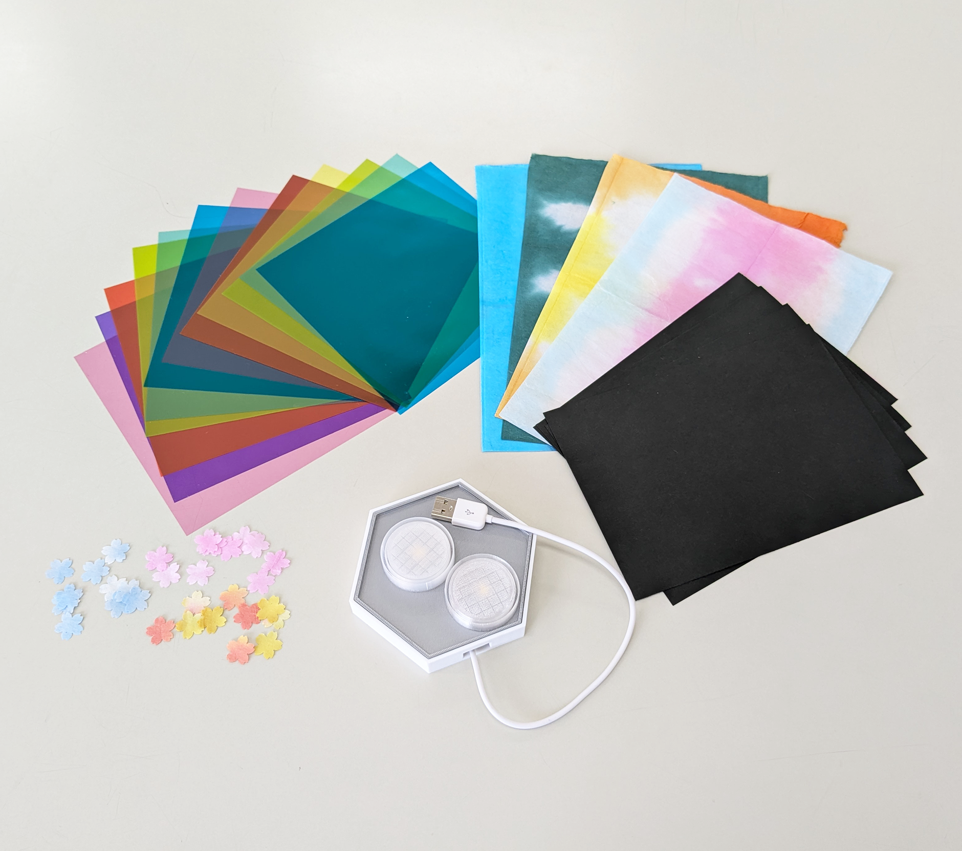 ・ランプシェードの材料(透明フィルム、和紙、桜型の和紙、黒いケント紙)