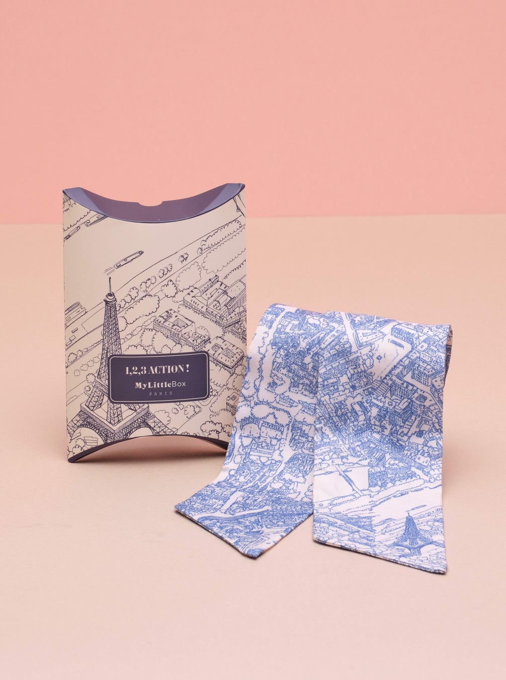 ファッションに取り入れやすい、リボンタイプのスカーフ。パリの地図を描いた繊細なデザインは、ファッションにさりげなくパリのエッセンスをプラスしてくれます。季節感のあるブルーとホワイトの色合いは、シックでありながら女性らしさも演出。首もとやバッグにさっと巻きつけるだけで、洗練された印象に仕上がります。さまざまなファッションアレンジを楽しめるリボンスカーフで、雨の日もおしゃれを楽しんでみませんか?
