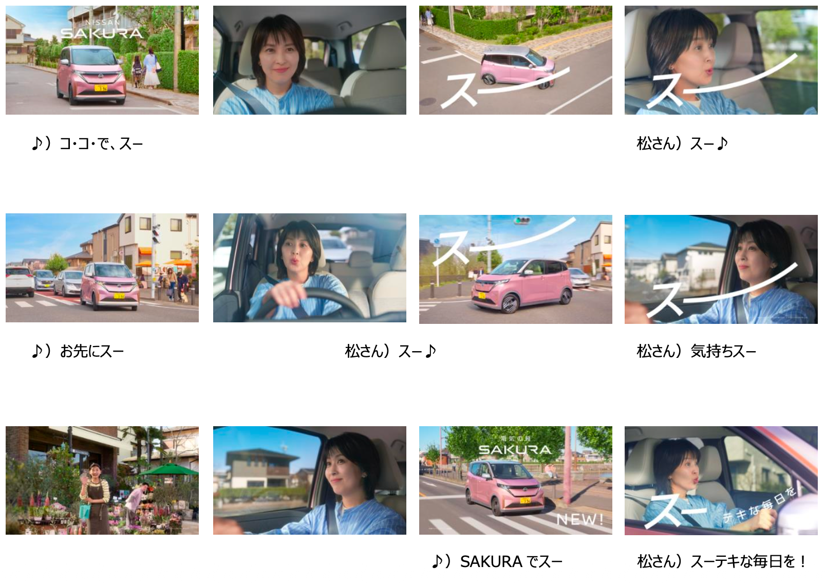 キャストは今回で「日産サクラ」のCM出演が4度目となる松たか子さんを起用。CMでは「コ・コ・で、スー♪お先に、スー♪」という楽曲に合わせ、暮らしの中で見慣れた街の中を気持ちよくドライブする松さんが、発進する瞬間やカーブする瞬間に「スー」と口ずさむ姿を描いています。