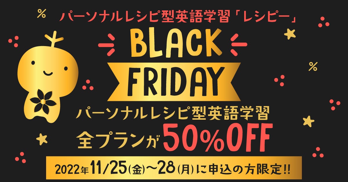 株式会社ポリグロッツ(本社:東京都新宿区、代表取締役:山口隼也)は、11月25日(金)~11月28日(月)までBlack Friday(ブラックフライデー)を開催いたします。開催期間中は、パーソナルレシピ型英会話の全プランを50%OFFでご提供します。このお得な機会に、英語学習を強化してください。