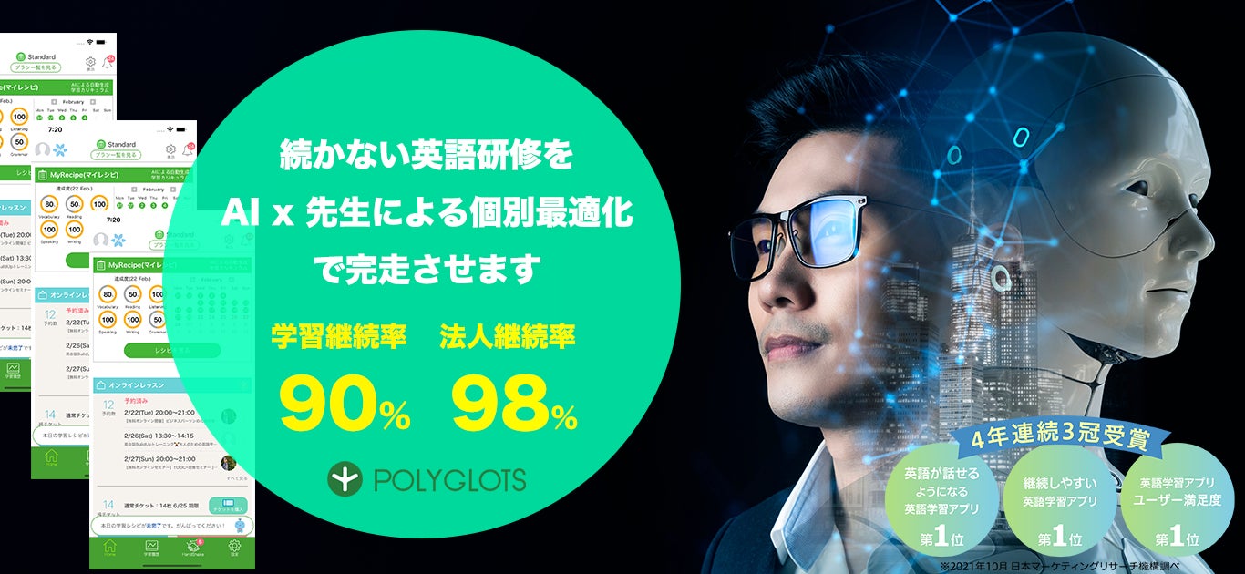 AI (アプリ) x 講師による個別最適化されたカリキュラムでビジネス英語が身につく英語研修サービスです。