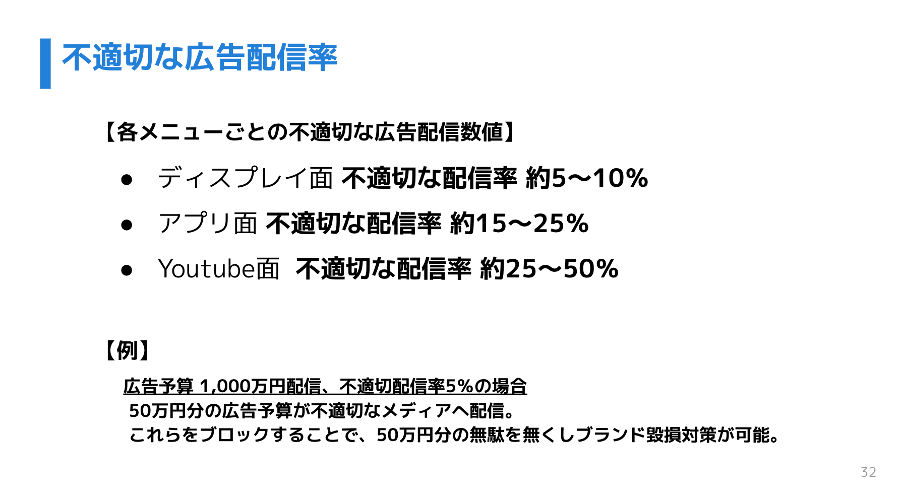 広告汚染の具体的な手口として、「Bot(ボット)による不正」「MFA(Made for Advertising)サイト」「著作権侵害コンテンツ」「ブランド毀損配信」の4つを解説しました。配信媒体別の不正広告出稿率を見ると、対策を行っていない場合、ディスプレイ広告で5〜10%、アプリ広告で15〜25%、YouTube広告では25〜50%もの割合で不適切な配信が発生していると指摘しました。