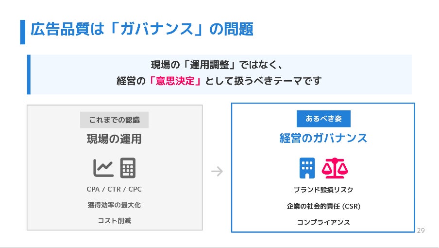 広告の配信先を適切に管理することは、無駄な広告費を削減して費用対効果を改善するだけでなく、企業のブランド価値や社会的信用を守るための重要なガバナンスの一環です。JICDAQ認証の取得を土台としつつ、リアルタイムな技術的対策を組み合わせることで、安心・安全なデジタル広告の運用を実現していく姿勢が重要であると締めくくりました。