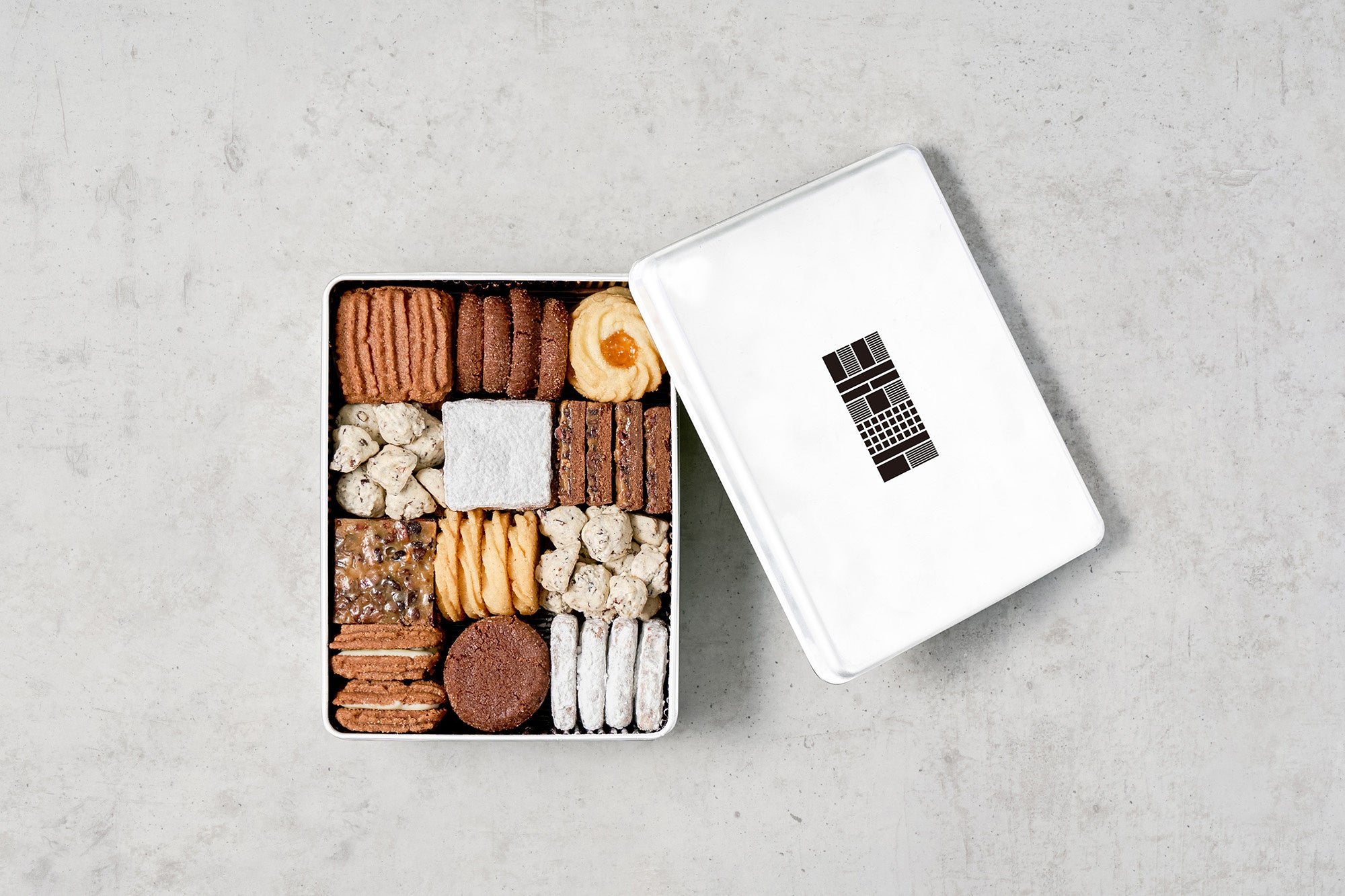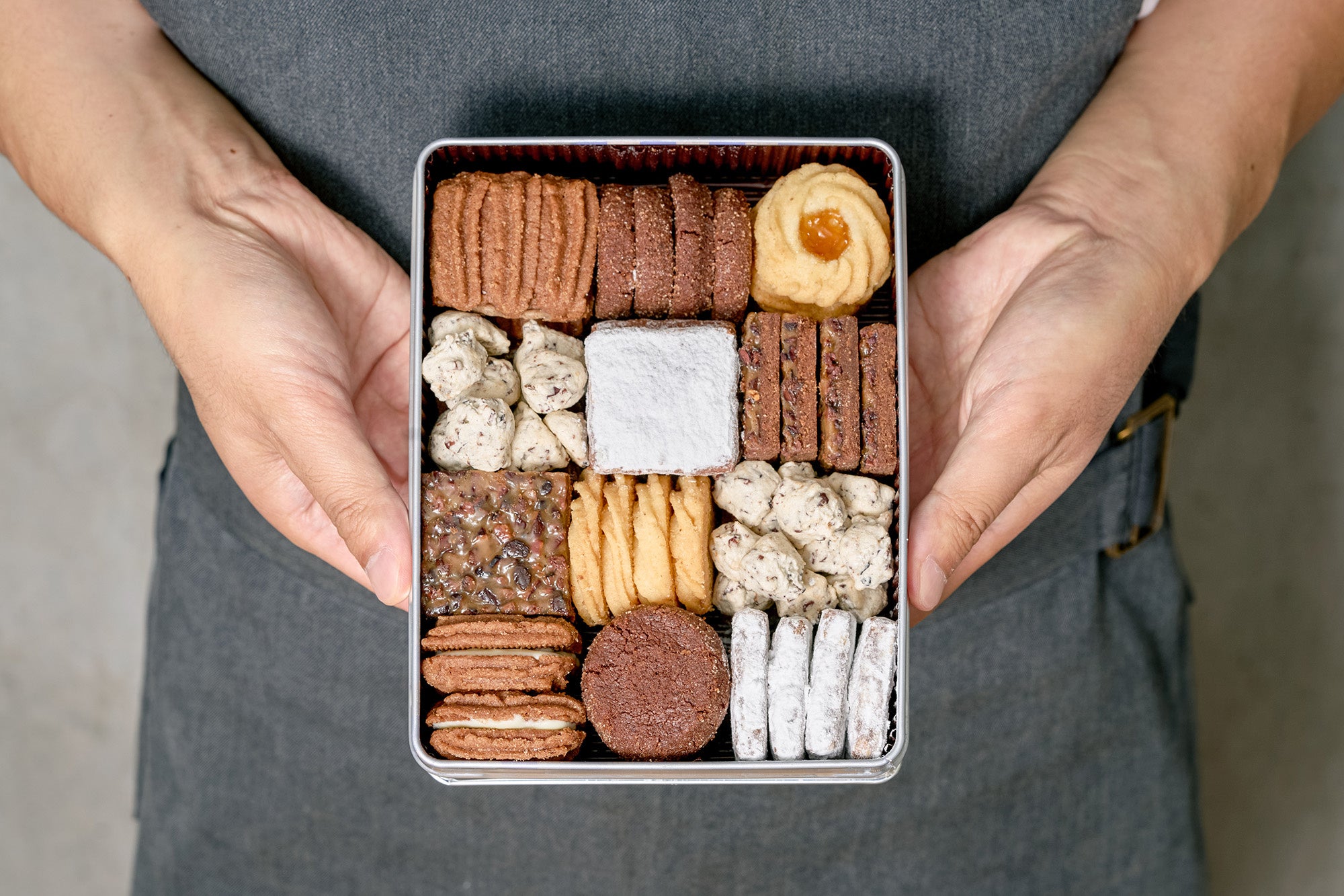 シンプルなあしらいの缶に、6種のクッキーが入っています。