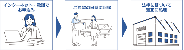 ・ インターネット・電話から申し込み後、収集運搬許可を保有する事業者が希望日時にご自宅へ回収に伺いま