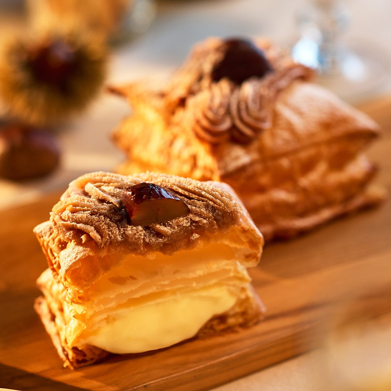 【栗スイーツ】大人な甘さのフランス産マロンが主役!ワンハンドで食べられる “新感覚” モンブランが登場!729層のサクサクパイで仕立てた「できたてミルフィーユ〔モンブラン〕」で贅沢なスイーツタイムを