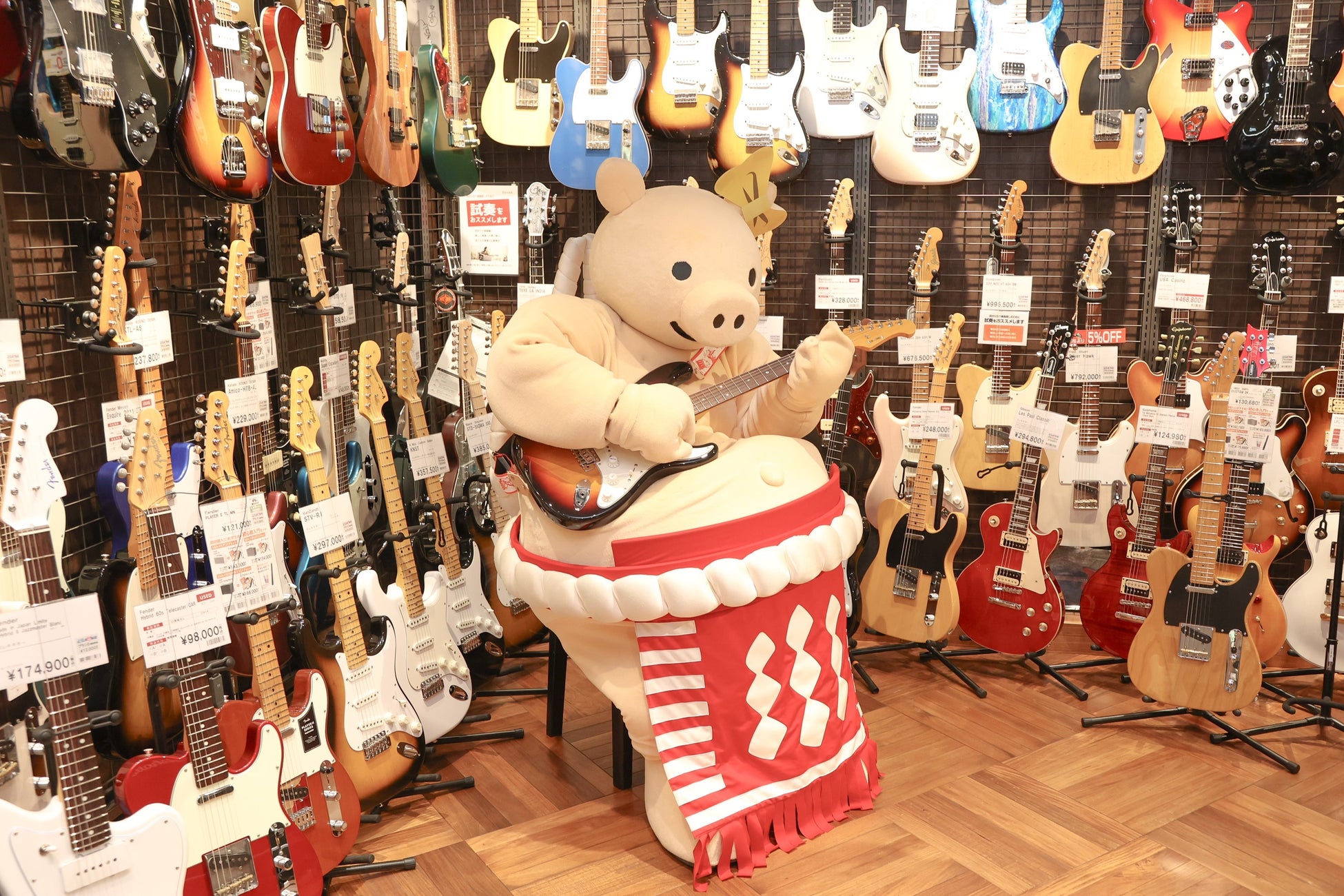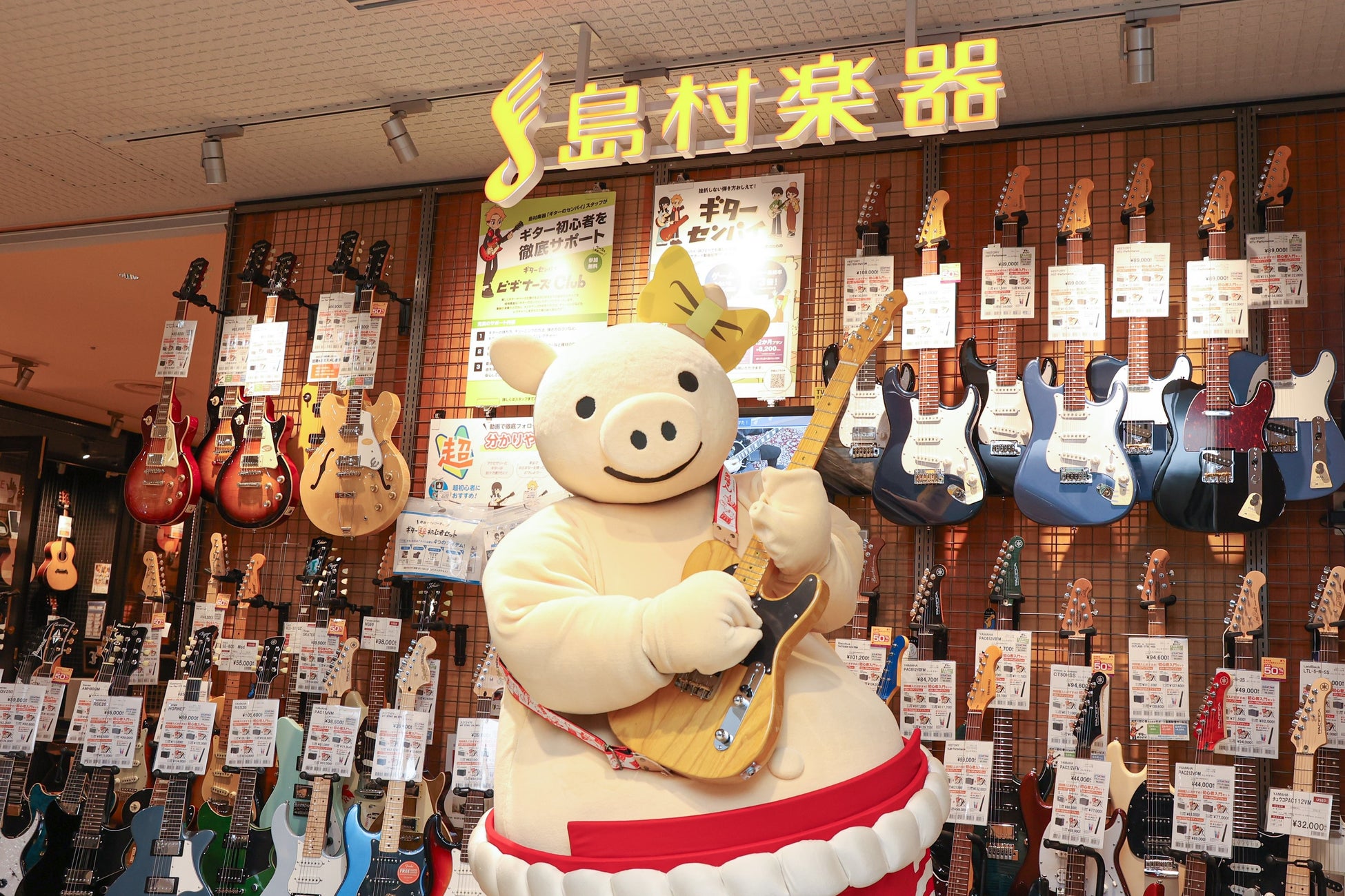 コラボを記念して、矢場とんの広報部宣伝課長である「ぶーちゃん」が島村楽器 名古屋パルコ店にご来店。