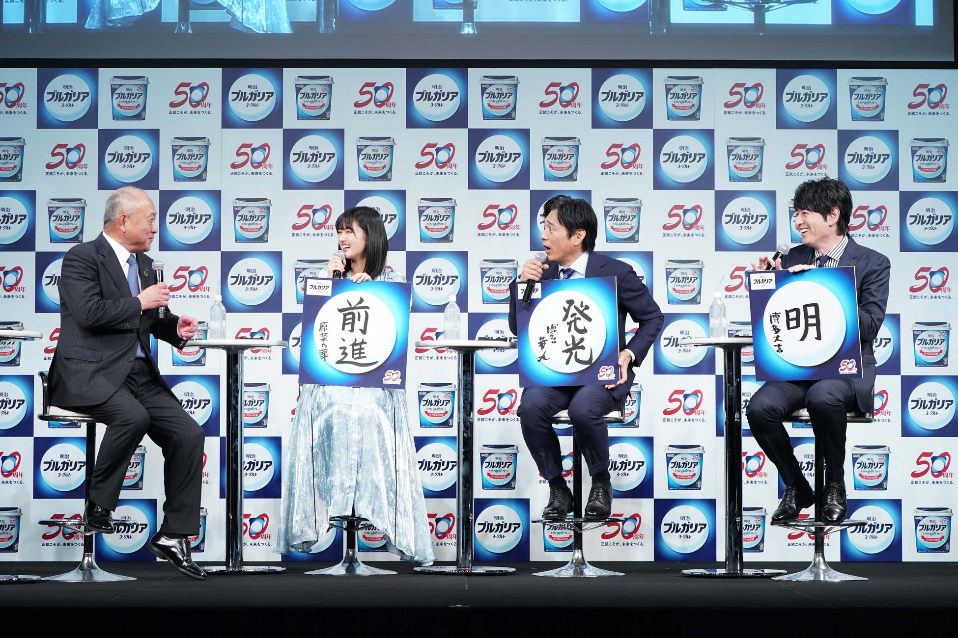 発表会では代表取締役社長 松田克也より50年後の100周年に向けて「明治ブルガリアヨーグルト」が描く未来に向けたビジョンや新たな取組みの発表を行いました。また、ゲストとしてお笑い芸人の博多華丸・大吉さん、新CMにご出演いただいた俳優の原 菜乃華さんもご登壇し、発表会を大いに盛り上げていただきました。