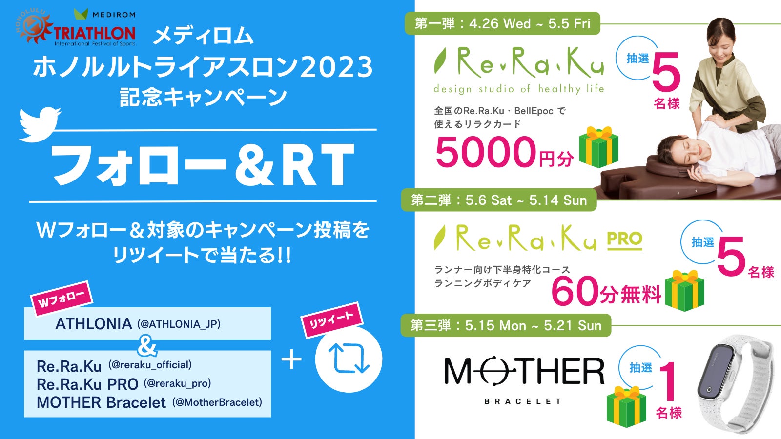 応募方法:Re.Ra.Ku公式Twitterアカウント(@reraku_official)とATHLONIA公式Twitterアカウント(@ATHLONIA_JP)の2つのアカウントをフォローし、@reraku_officialのキャンペーン投稿をリツイート
