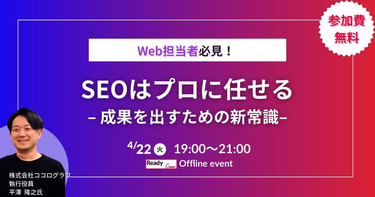 ビジネスマッチングサービス「Ready Crew(レディクル)」を運営する、フロンティア株式会社(本社:東京都渋谷区、代表取締役社長:高橋 政裕、以下 当社)は、最前線で活躍する株式会社ココログラフ 執行役員 平澤隆之 氏を講師にお招きし、SEOで成果を出すための具体的なポイントについて解説していただきます。SEO対策を進めているものの効果が実感できない方、競合との差別化に悩んでいる方にとって、最新の施策を学ぶ絶好の機会です。さらに、セミナーに加えて交流会も開催いたします。業界を超えたネットワーキングの場として、アルコールを含むお飲み物や軽食をご用意しておりますので、ぜひご参加ください。