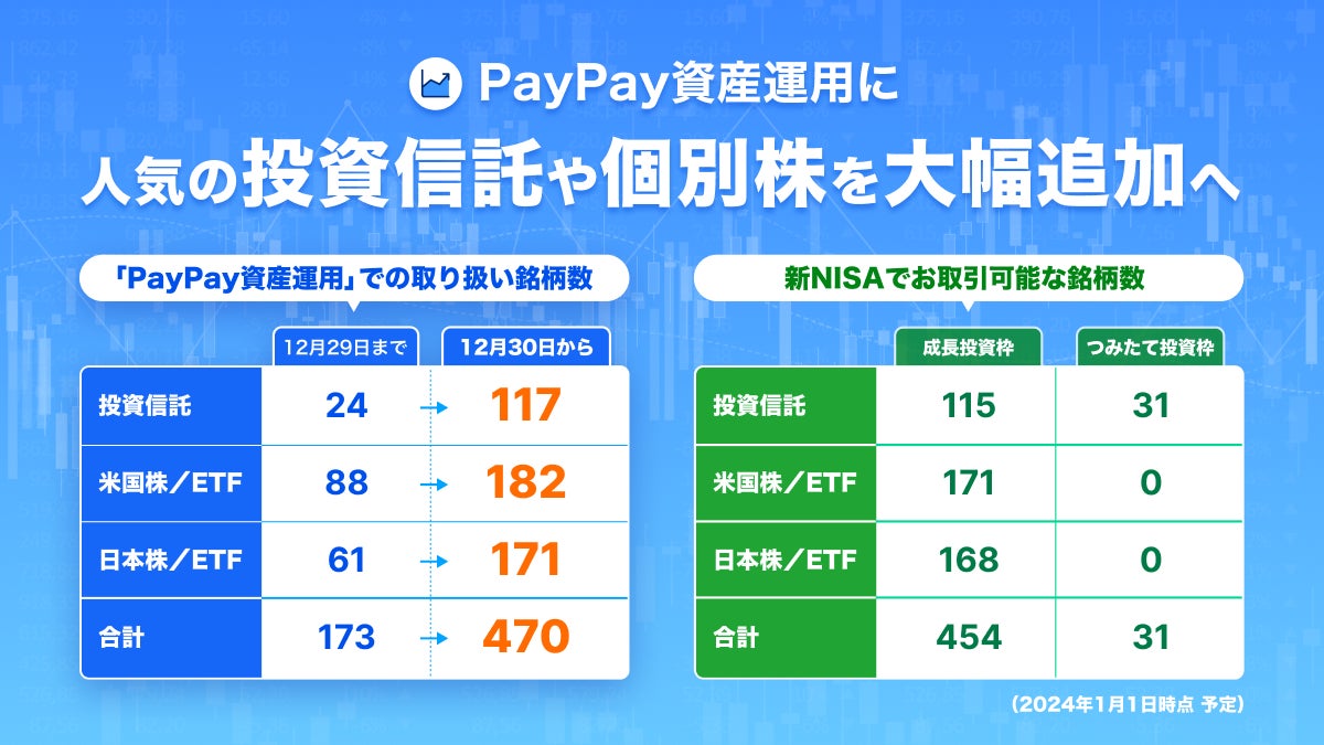 PayPay証券株式会社(東京都千代田区、代表取締役社長:番所 健児、以下「PayPay証券」)は、キャッシュレス決済サービス「PayPay」内のミニアプリ(※1)「PayPay資産運用」の取り扱い銘柄を2023年12月30日に追加します。すでに取り扱いをしている173銘柄に加え、投資信託93銘柄、米国株 94銘柄、日本株110銘柄を新たに追加し、全470銘柄をPayPayポイントやPayPayマネーを使って購入できるようになります。投資信託は、インデックスファンドはもちろんアクティブファンドも含めすべて購入手数料がかからないノーロード投資信託で、新NISAの成長投資枠で購入いただける115銘柄のうち、つみたて投資枠で購入いただけるのは31銘柄となります。つみたて投資枠での購入は、「PayPayマネー・PayPayポイントによるつみたて」はもちろん、「クレジットつみたて」も利用できます。