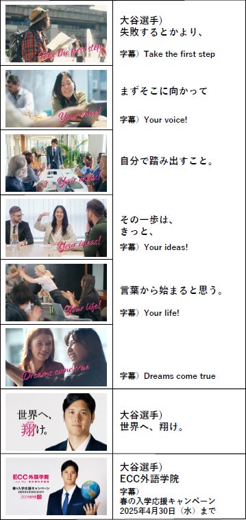 総合教育・生涯学習機関の株式会社ECC(本社:大阪市北区、代表取締役社長:花房雅博)が運営するECC外語学院は、ECCブランドアンバサダーでメジャーリーガーの大谷翔平選手が出演する新TVCM『ECC外語学院「The world is waiting!」篇』(15秒、30秒)を制作。2025年1月6日(月)より近畿・関東エリアで放映を開始いたします。