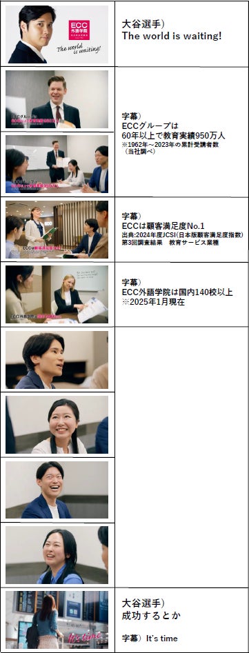 旅を通して異なる文化や異なる国・地域の人々と出会ったり、ビジネスの中でさまざまな背景を持つ人と共に働き、一緒に目的を達成したりする――新TVCMは、広い世界へといざなうような大谷翔平選手の「The world is waiting!」という言葉から始まり、さまざまな人たちが「ECC外語学院」での学びを通して、新たなステージへの一歩を踏み出し、夢をかなえていくまでのストーリーを描いています。