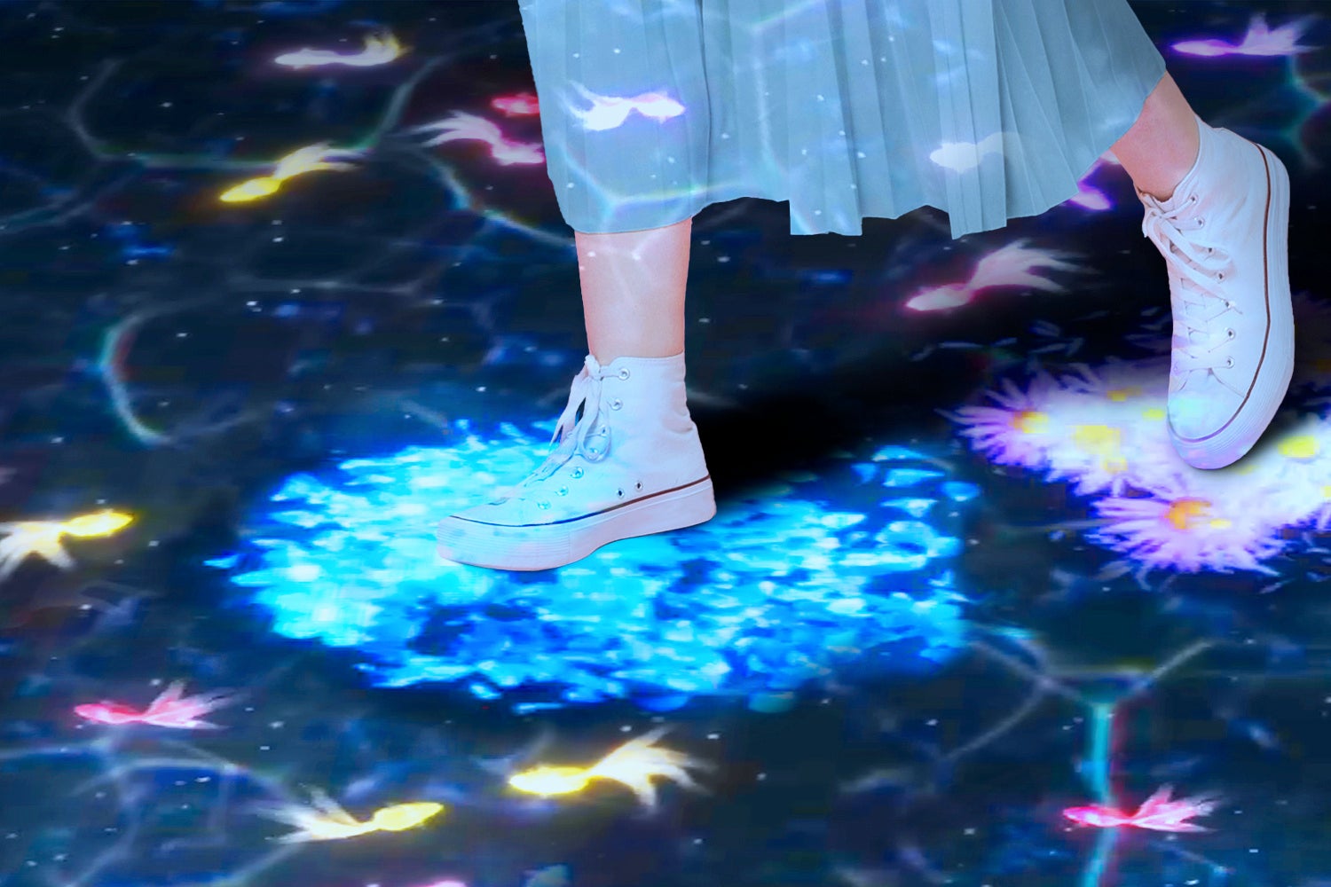 園内の池は、江戸時代の作庭当時、海水が流れ込む「潮入りの池」であったことから着想したプロジェクションマッピング。ゆらゆらと泳ぐ魚たちに触れると、演出が華やかに変化します。