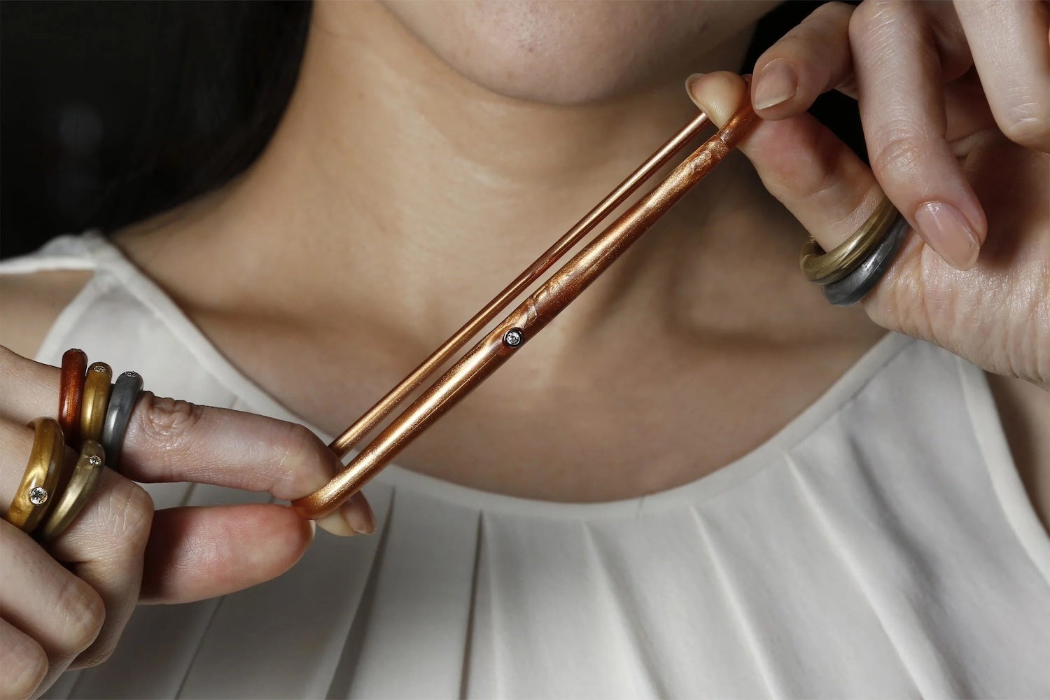 純金・純プラチナと上質なシリコンを組み合わせた新素材ジュエリー。耐熱性(200℃)、耐寒性(-70℃)、撥水性、伸縮性、柔軟性、絶縁性に優れており、金属アレルギーを引き起こしにくい安全性の高い素材で、日本を含む複数の国で特許を取得。熟練の職人と若手の企画者がチームを組み、高品質かつ変化する市場のニーズに応えた柔軟かつ革新的なデザインのジュエリー。