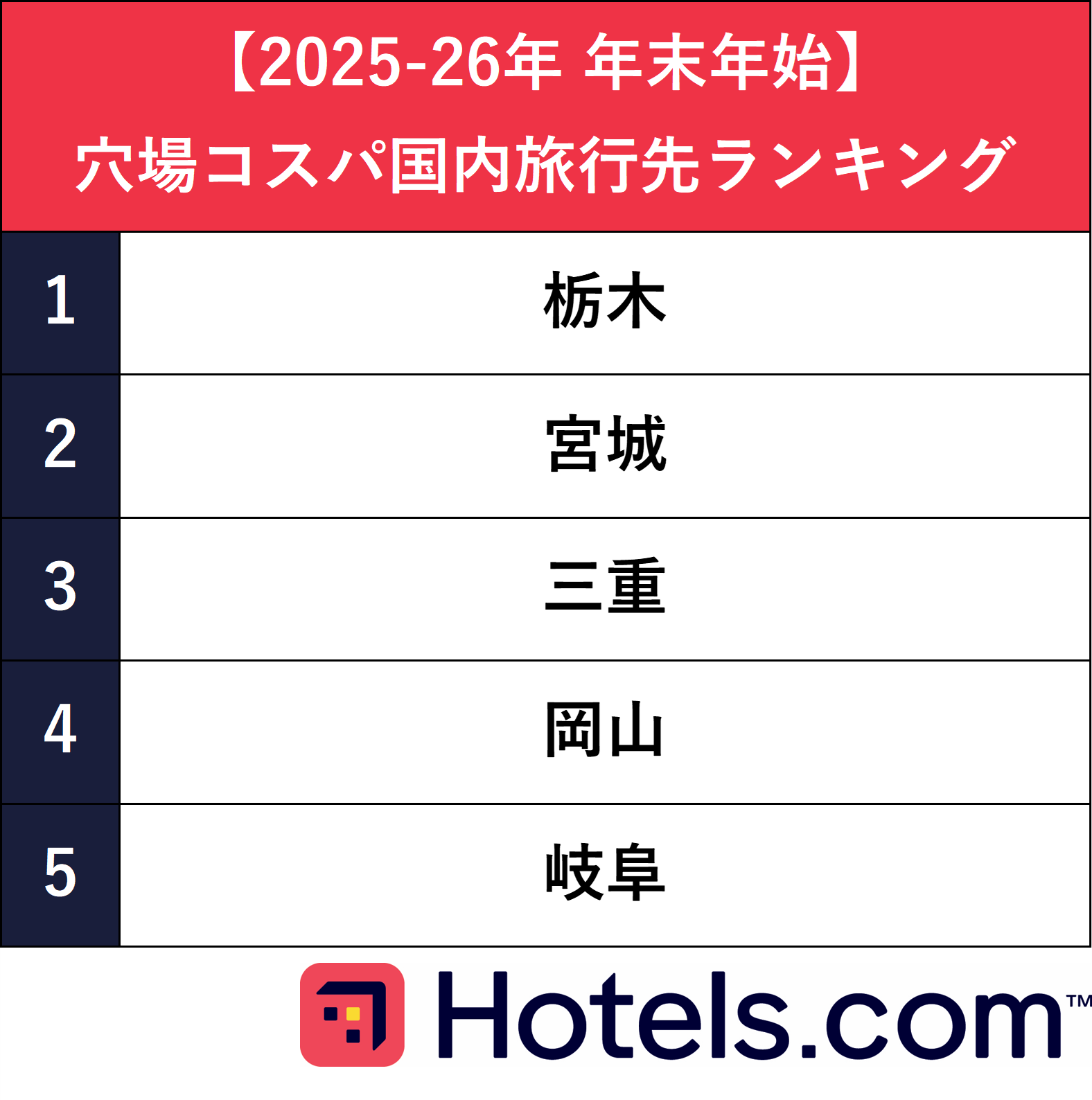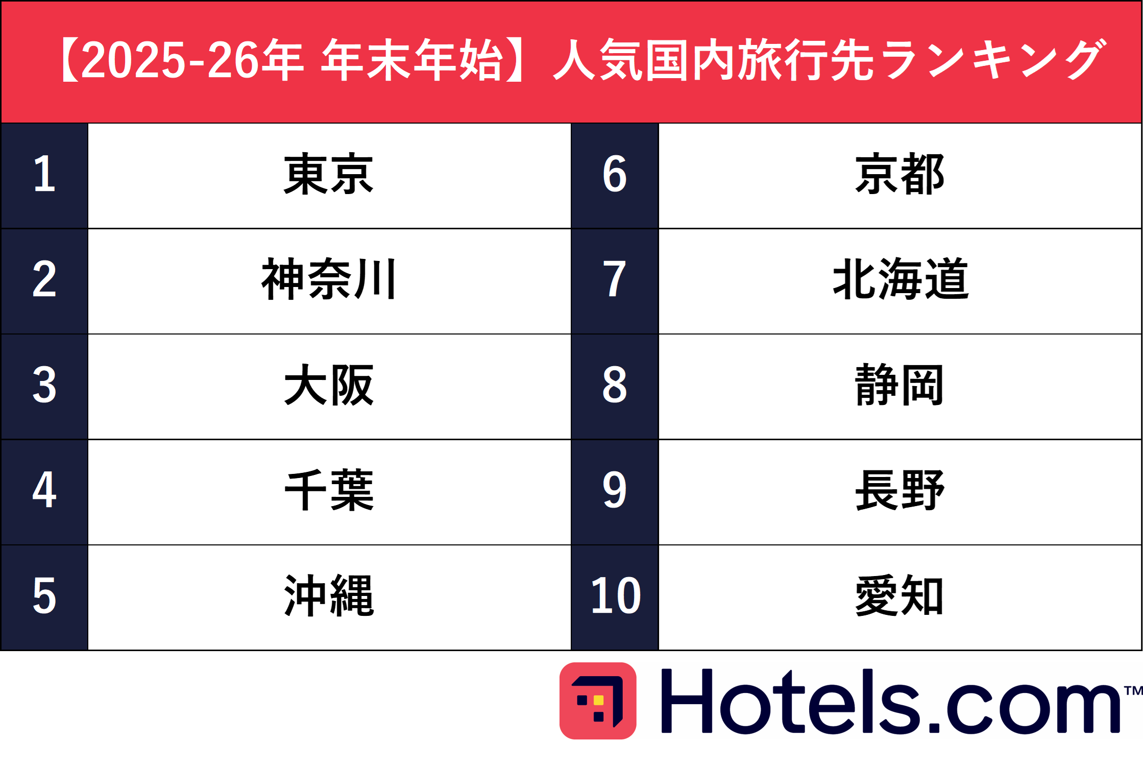 Hotels.comは、2025年~2026年の年末年始における「穴場コスパ国内旅行先ランキング」や「人気国内旅行先ランキング」に加え、「ホテルの混雑日やお得な宿泊日予想」を発表します。