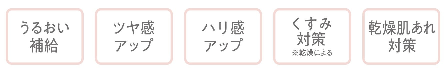 お肌の乾燥は、様々な肌悩みを引き起こします。「乾燥」、「ツヤ」、「ハリ」、「くすみ※4」、「乾燥肌あれ」に複合的にアプローチすることで、ツヤをまとったみずみずしい素肌へととのえます。