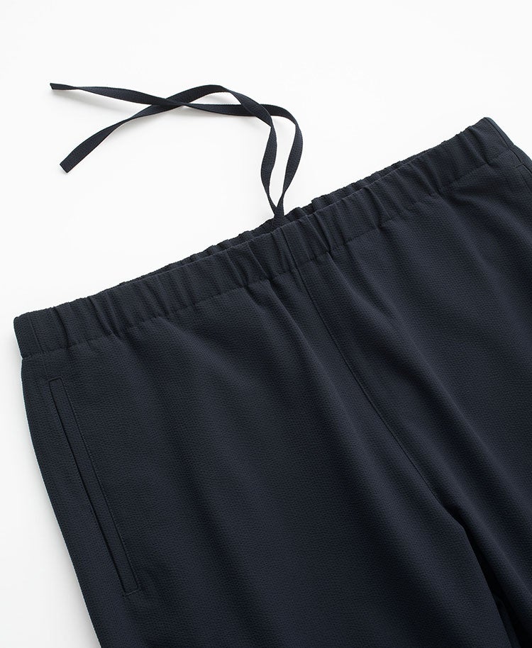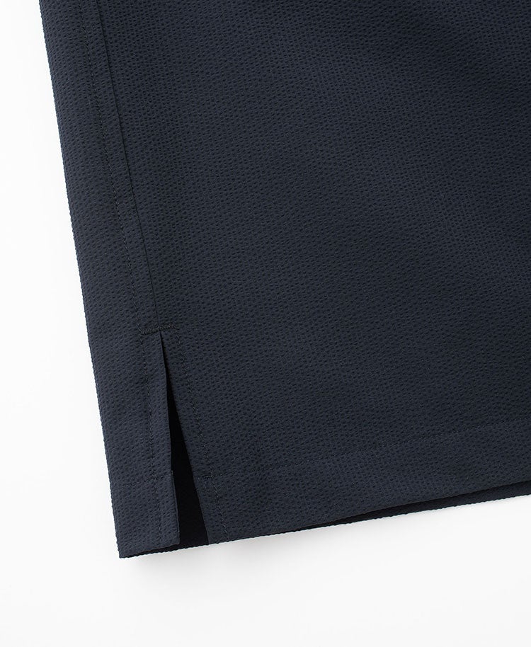 シアサッカー特有の凹凸のある生地が肌との接地面を減らし、汗ばむシーンでも快適さを保ちます。夏場の医療現場で働く人々に向けた、清涼感と美しさを兼ね備えた一着です。