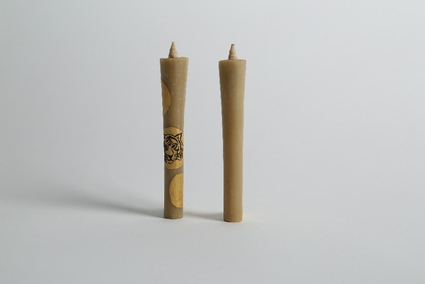 創業110年以上の歴史を持つ松井本和蝋燭工房による、国内産・ハゼの実蝋のみを使用した、全工程手作りで作られた伝統の和ろうそく。職人さんが1本1本丁寧に、絶滅危惧トラの亜種のインドシナトラを手描きで絵付けしました。トラの絵柄はアースアワー用にデザインしたWWFオリジナルです。