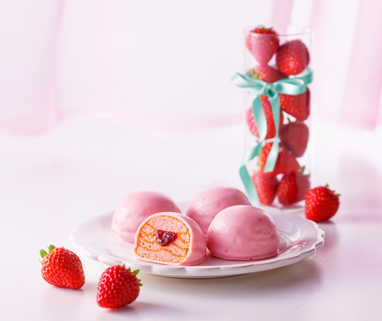 あまおういちごジャムを閉じ込めたまるい生地をつぶつぶ果肉の入ったいちごのコーティングで仕上げました。