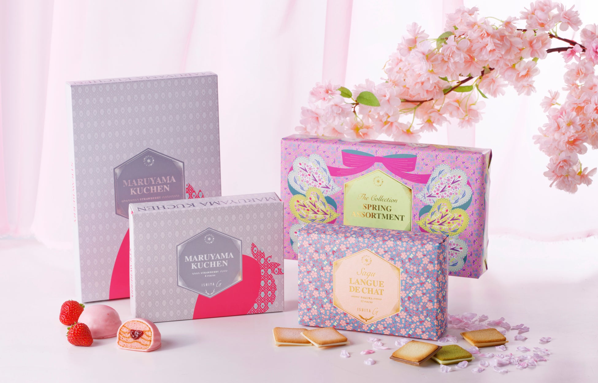 ISHIYA Gの定番商品「サク ラング・ド・シャ」の期間限定フレーバー「さくら」を含む7種と「マルヤマクーヘン(ストロベリー)」を詰め合わせたアソート。