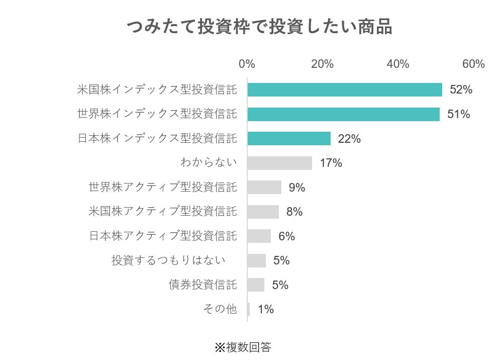 - つみたて投資枠で投資したい商品は「米国株インデックス型投資信託」と「世界株インデックス型投資信託」の2種が僅差でトップ1・2