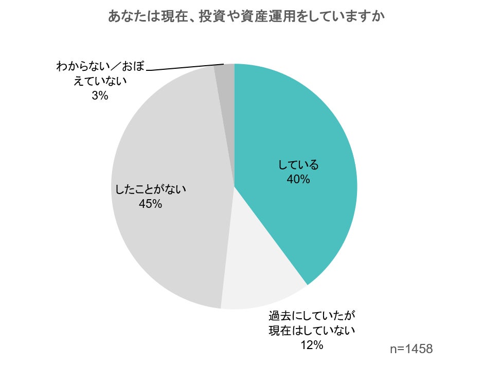 ・アンケート回答者のうち、現在投資や資産運用をしている人は40%