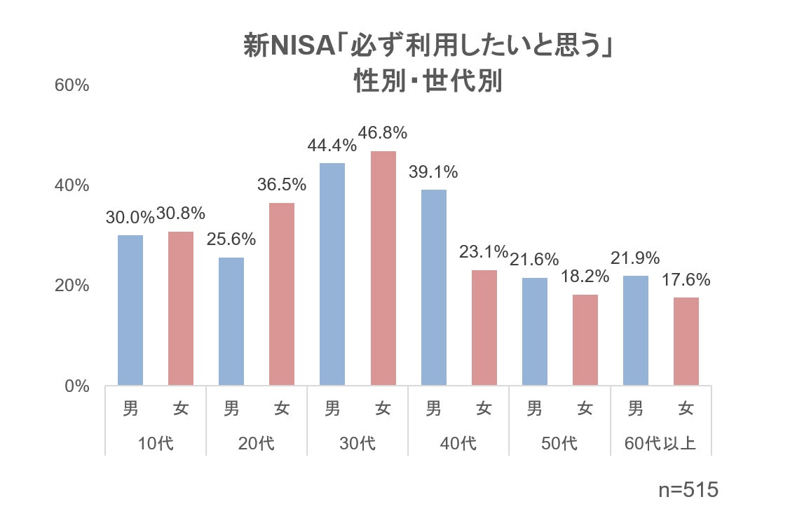 ・男女別/世代別では、「必ず利用したいと思う」と答えた人は30代女性で47%と最も高い