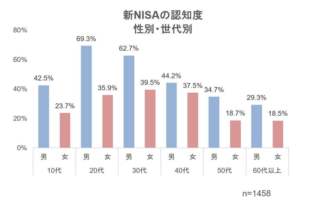 ・男女別/世代別では、20代男性の認知度が69%と最も高い