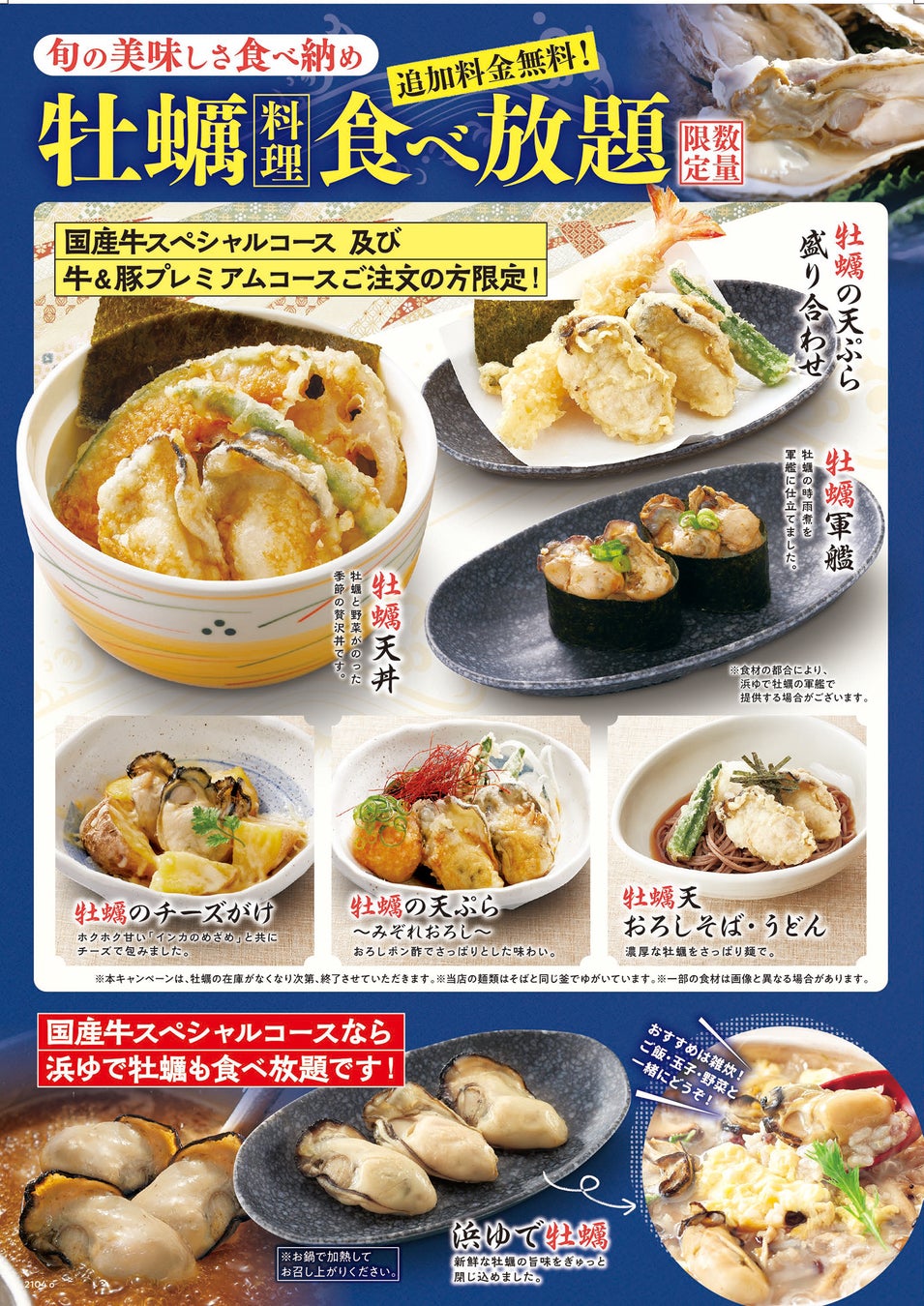 - 和食さと 食べ放題牛&豚プレミアムコース以上ご注文で、今だけ「牡蠣料理食べ放題」が無料でついてくる!!
