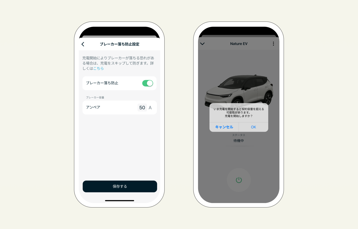 家庭で電気を使いすぎて契約容量を超えると、ブレーカーが落ちて停電することがあります。本製品は、こうしたリスクを防ぐために、充電開始前後の電力消費量をモニタリングし、契約容量を超えるおそれがあると、自動で充電開始時間の調整および充電の停止を行います。また「Nature Home」アプリ上で警告や通知を行うことで、安全で安心な充電を実現します。