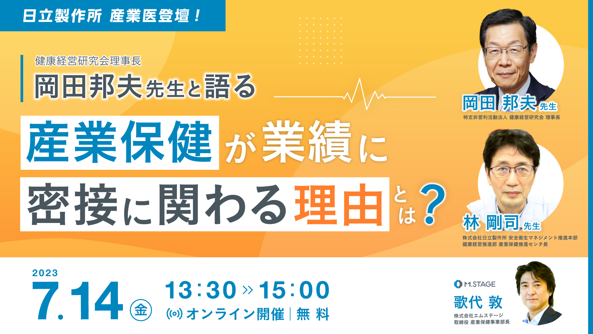 この度、エムステージは、そのような悩みを抱える人事労務・健康経営ご担当者向けに、無料オンラインセミナーを開催いたします。健康経営研究会 理事長の岡田邦夫先生、日立製作所 産業医の林剛司先生をお招きし、事例やパネルディスカッションを用いて『産業保健が業績に密接に関わる理由』を解説します。
