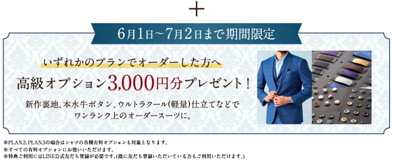 PLAN1~PLAN3いずれかのプランでオーダーした方には高級オプション3,000円分プレゼントしております。