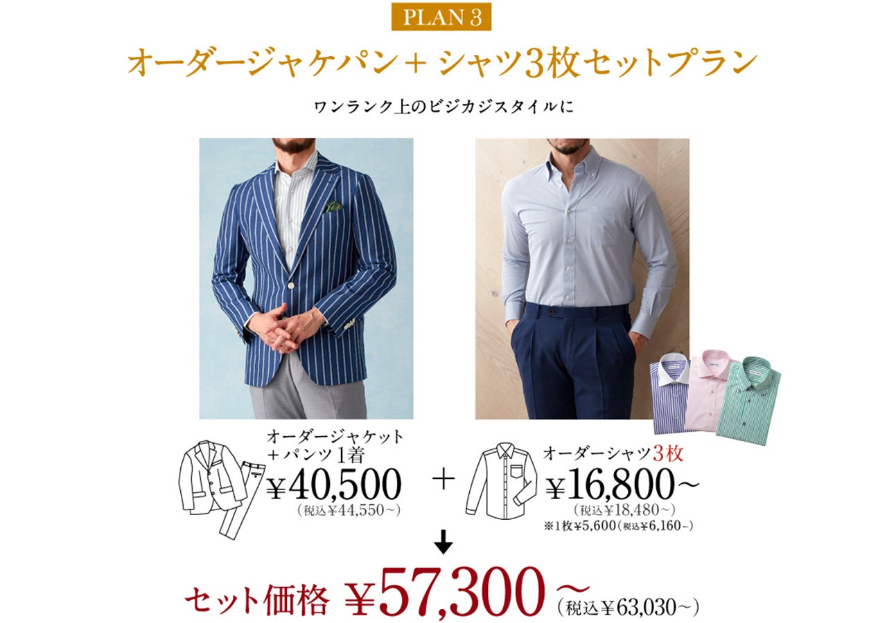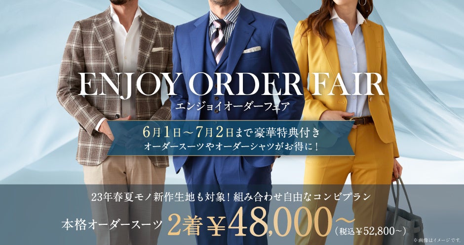 そこで、今回新たに開催する「ENJOY ORDER FAIR(エンジョイオーダーフェア)」では、定番のオーダースーツだけでなく、夏のシーズンにぴったりなクールビズ(ビジカジ)スタイルに対応したシャツやジャケパンのまとめ買いもお得になるプランをご用意いたしました。クールビズ(ビジカジ)スタイルを一気にアップグレードするのに最適です。