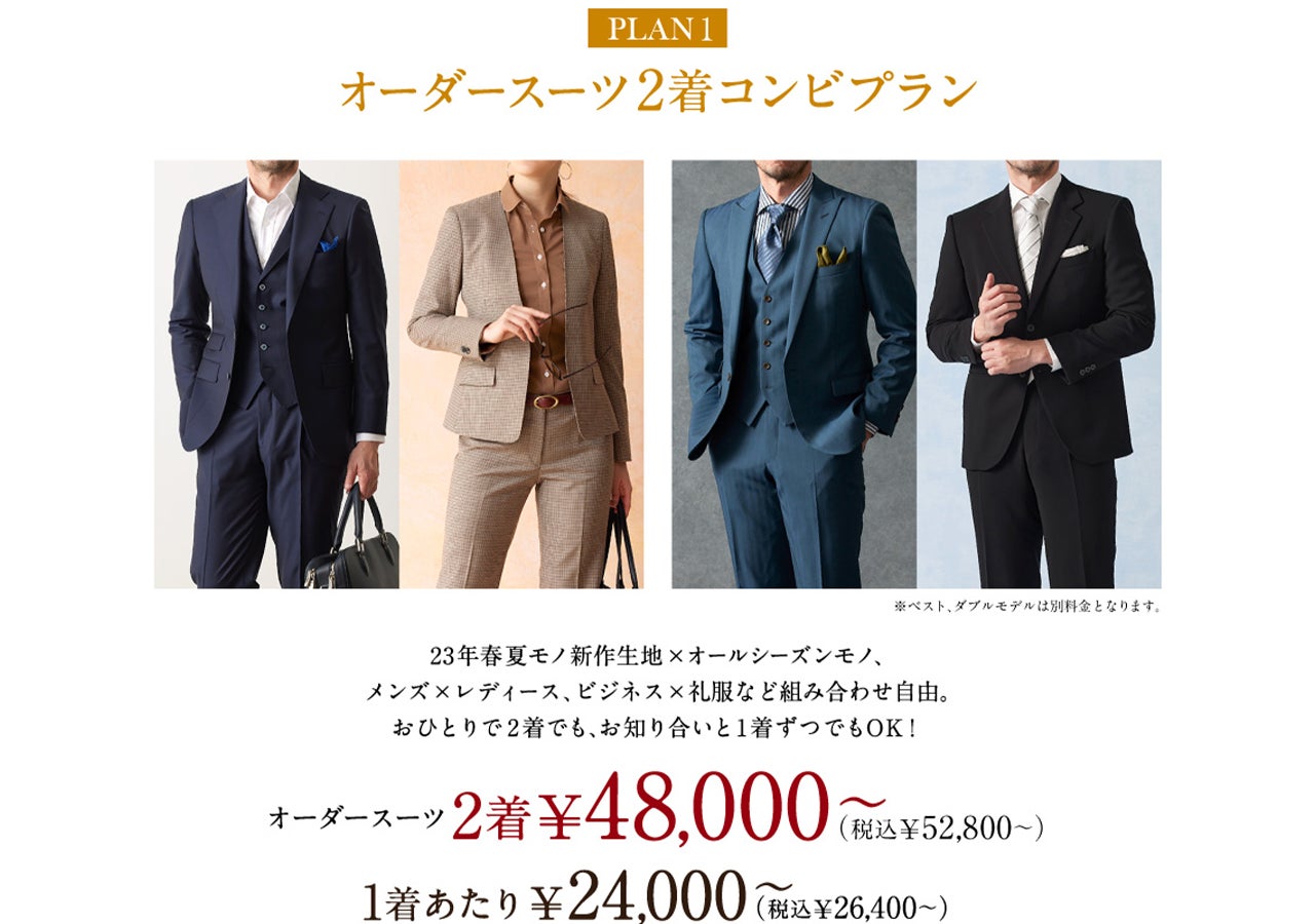 本格オーダースーツが2着¥48,000~(税込¥52,800~)