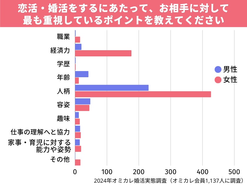 一方で、男性は「容姿」「年齢」を最も重視すると答えた人が女性に比べてやや多め。