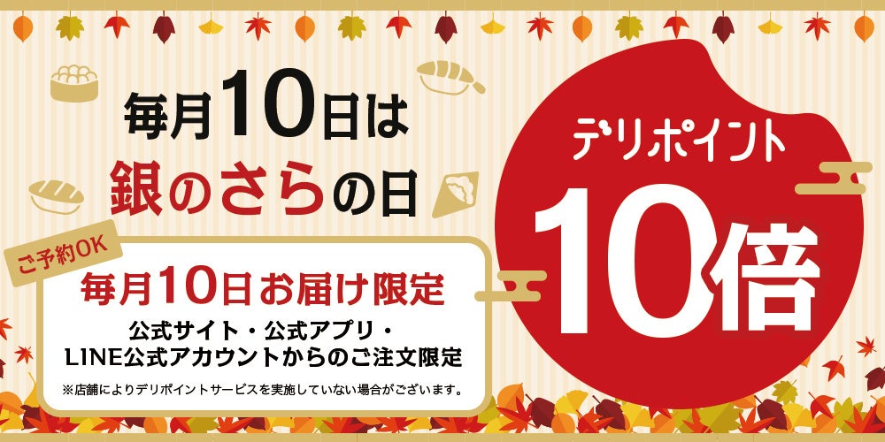 この機会に「デリポイント」を貯めてお得に「銀のさら」のお寿司をお楽しみください。