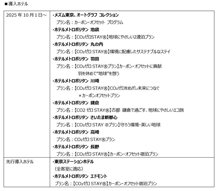 このたび、首都圏を中心にホテルを展開しサステナブルで高品質のサービスを追求する日本ホテル株式会社(本社:東京都豊島区)様にて、「CO₂ゼロSTAY🄬」の導入を拡大する事が決定しました。すでに導入済みの東京ステーションホテル、ホテルメトロポリタン エドモントに加え、2025年10月1日よりメズム東京、オートグラフ コレクションやメトロポリタンホテルズ8施設でも導入を開始し、計11のホテルで展開され、より多くのお客様が利用可能となります。