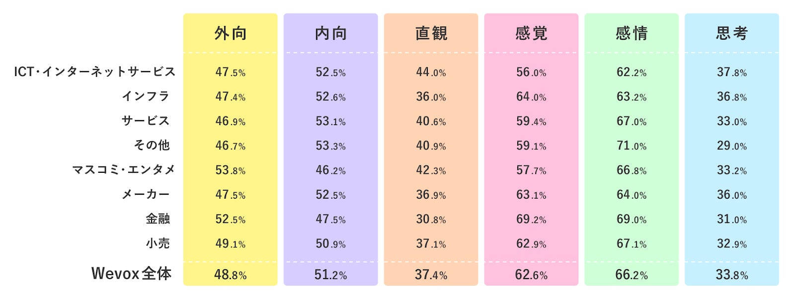 ICT・インターネットサービス業界では、「直観」や「思考」が優位な特性を持った方が多く、企画開発など抽象的・論理的な思考が求められることなどが考えられます。
