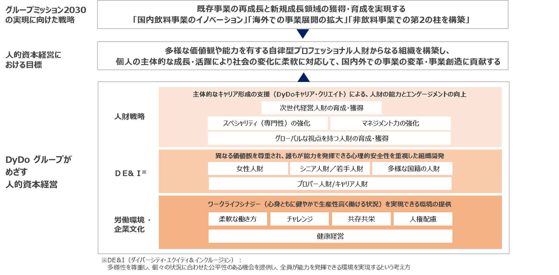 外部環境の変化に対応して目標達成するためには、多様な分野における専門性の強化と、様々な環境における組織やプロジェクトのマネジメント力の強化が極めて重要と考えております。また、“グループミッション2030”では「海外での事業展開の拡大」を基本方針の1つに掲げており、グローバルな視点を持つ人財の育成・獲得が欠かせません。当社グループは、その実現に向け、これまでの人財に関する取り組みを進化させ、従業員の主体的キャリア形成を支援する仕組み「DyDoキャリア・クリエイト」を導入いたします。個人のキャリア形成に主眼を置いた人事制度・育成プログラム・評価制度等を導入し、これらの運用を通じて、求める資質を備えた人財一人ひとりの成長とエンゲージメントの向上を図り、能力の多様性に富む強い組織の構築をめざします。なお、本仕組みにおける施策は、優先度の高いものから、各セグメントの状況に合わせて段階的に導入を進めてまいります。