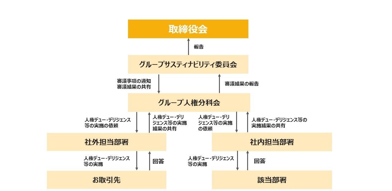 今後、この方針に基づく人権デュー・デリジェンス等の実施に向け、グループサステナビリティ委員会の下に「グループ人権分科会」を新設し、人権尊重に関する取り組みをさらに推進していきます。