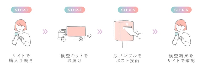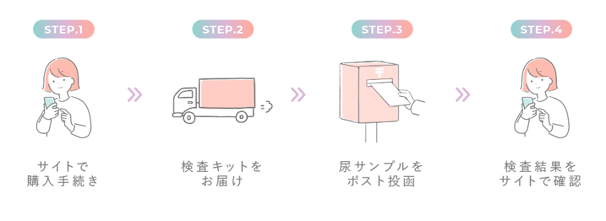 購入サイトでキットを購入後、最短翌日にお届けします。中身がわからないようプライバシーに配慮したシンプルな梱包でポストにお届けするので安心。尿を採取したら検体を封筒に入れてポストに投函すると、6日〜10日程度で購入サイトにて検査結果を確認することができます。