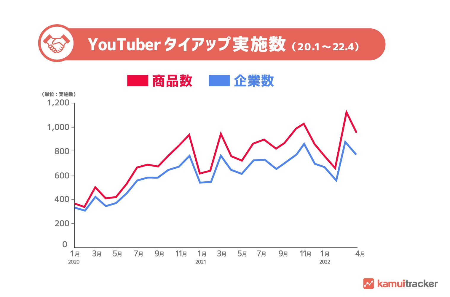 2022年末時点では5,366社まで増えることが予想され、その場合、前年比約1.5倍の伸びとなります。また、2020年以降の月別で見ても、コロナ禍以降も実施数は増加傾向にあり、YouTuberタイアップがプロモーションの手法として存在感を増していることがうかがえます。