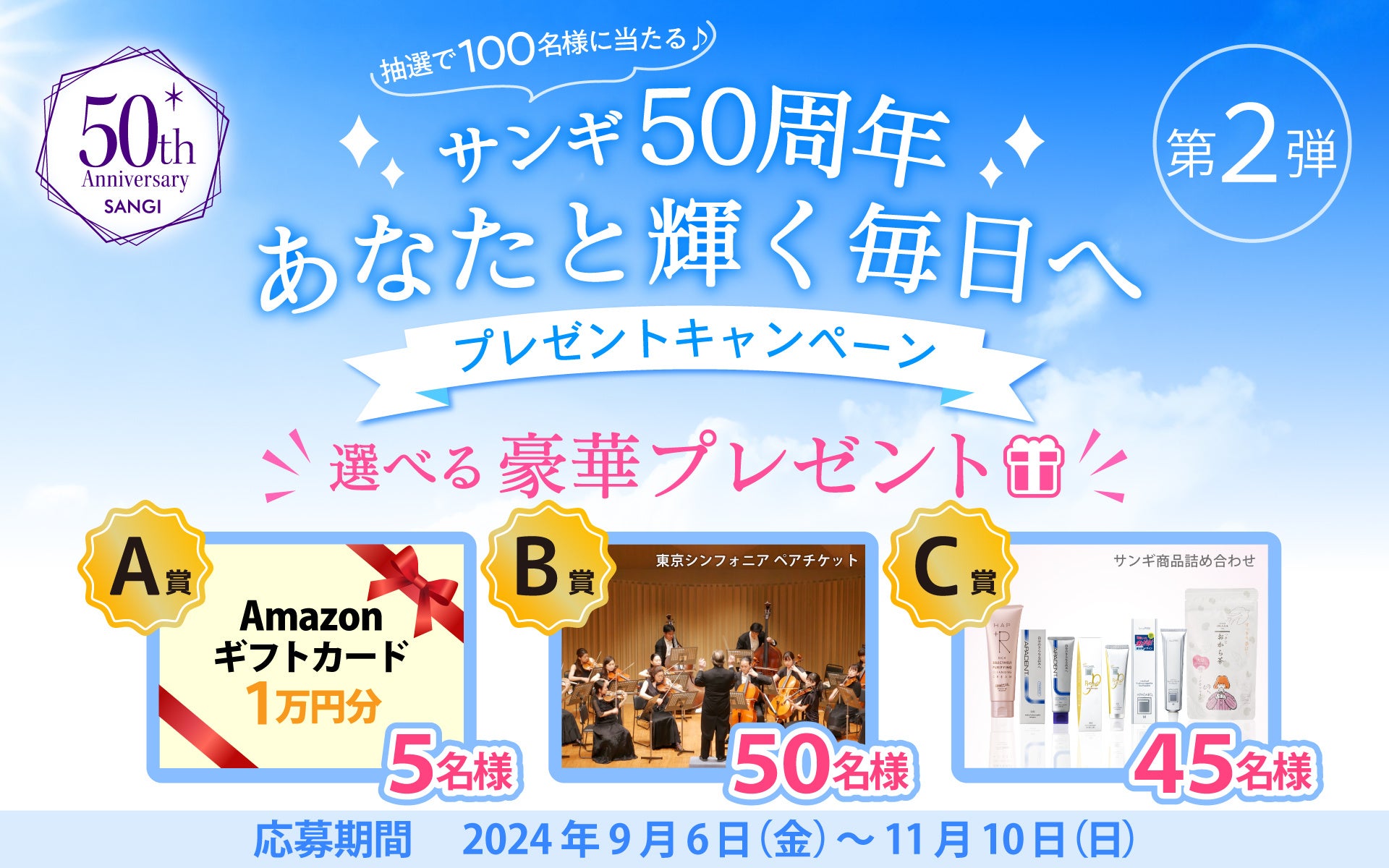 <第2弾> A賞 あなたと輝く毎日を応援する「Amazonギフトカード1万円分」 5名様 B賞 あなたと輝く音楽の夜「東京シンフォニアペアチケット」 50名様 C賞 あなたを輝かせる「サンギ商品5アイテム詰め合わせ」 45名様 |