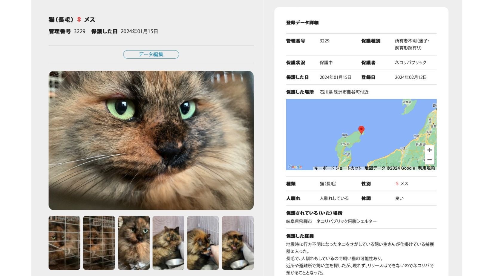 一般社団法人ネコリパブリック(所在地:岐阜県岐阜市正木、代表理事:河瀬麻花)は、株式会社 Easy Communications(東京都港区南麻布 代表取締役内海友貴)および、特定非営利活動法人 日本動物保護取扱環境支援機構(通称NPO SAP、東京都)と共に、能登半島地震の動物レスキューに役立つ、民間団体における所有者不明動物の保護に関するガイドラインと、保護された動物の情報を集約する検索可能なデータベースの開発に協力し、リリースしました。