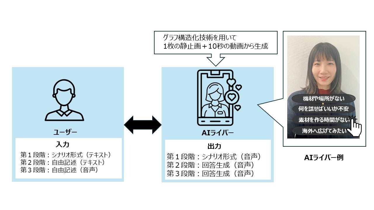 また、グラフ構造化技術を用いることで、静止画1枚および短時間の動画素材等から高品質なAIライバーを生成し、より自然なふるまいでの応答が可能になるかを検証します。
