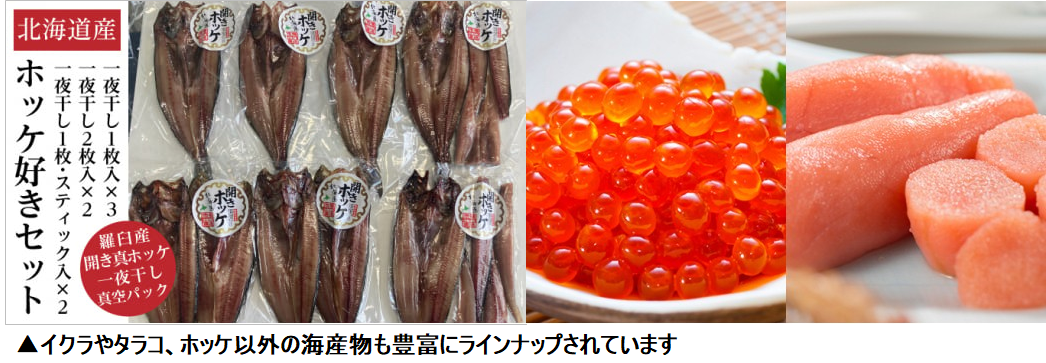 ▶▶▶もちろん、ホッケ以外の海産物やいくらやたらこも豊富にご用意。晩酌が楽しみなラインナップです。その他、チーズ・ヨーグルト・アイスクリームなども人気で迷ってしまいますね。